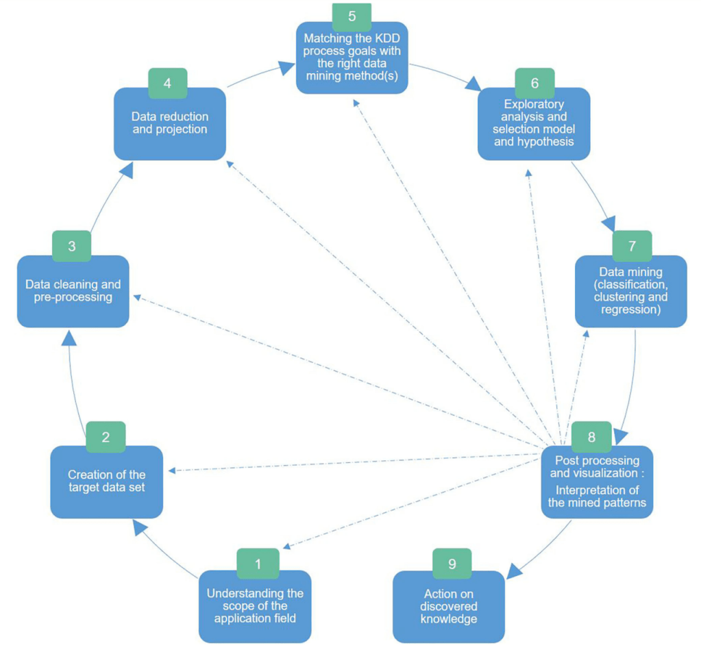 Concretely, as illustrated in Figure 5, the KDD stages encompass the following: (1) understanding the scope of the application field; (2) creation of the target dataset; (3) data cleaning and preprocessing; (4) data reduction and projection: reducing the number of variables to be analyzed by reducing the dimensionality of the data, extracting invariant representations, or searching for relevant characteristics; (5) matching the goals of the KDD process with the right method(s) in data mining; (6) exploratory analysis and selection model and hypothesis: selection of the data mining algorithm and method that will be used for the pattern search; (7) data mining: searching for interesting patterns in a particular form of representation, which includes rule and tree classification, regression, and clustering; (8) data postprocessing and visualization: interpretation of the patterns found with possible return to any step from 1 to 7 for a new cycle; and (9) action on discovered knowledge.