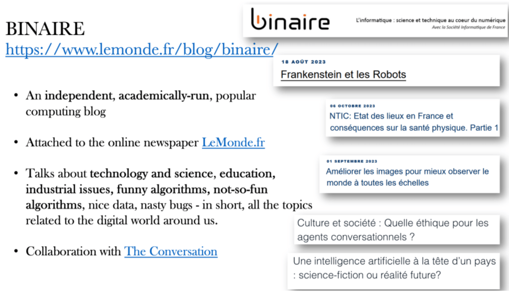 - Author and editor since 2018 of the blog http://www.scilogs.fr/intelligence-mecanique of the magazine “Pour la Science”